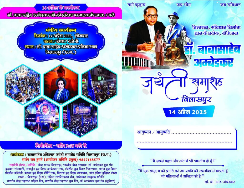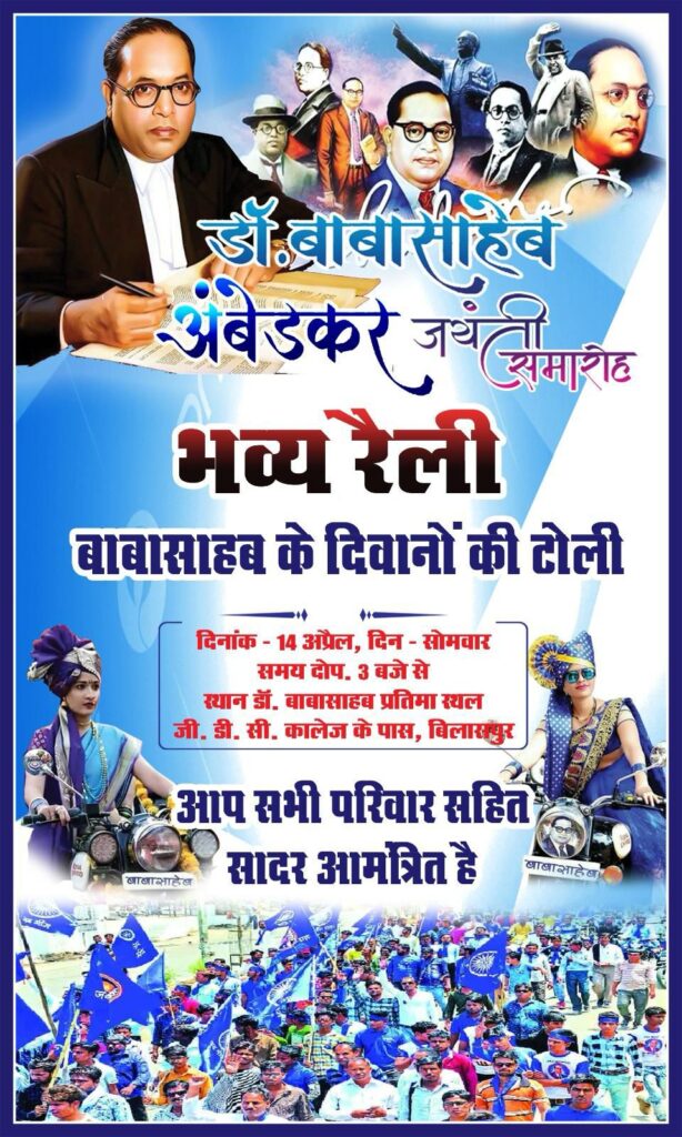 ज्ञान के प्रतीक, संविधान निर्माता और सामाजिक न्याय के पुरोधा डॉ. भीमराव अंबेडकर की 134वीं जयंती के अवसर पर बिलासपुर में एक उद्देश्यपूर्ण एवं भव्य कार्यक्रम का आयोजन किया जा रहा है। जयंती समारोह की शुरुआत 14 अप्रैल को प्रातः 9 बजे बाबा साहेब की प्रतिमा पर माल्यार्पण कर की जाएगी, जो जी.डी.सी. कॉलेज के सामने स्थित है।